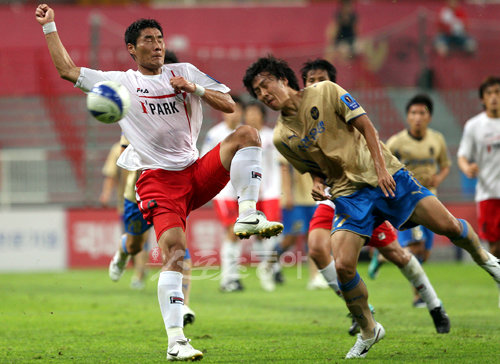 18일 오후 부산아시아드주경기장에서 열린 FA컵 8강전 부산 아이파크와 인천 유나이티드의 경기에서 부산 정성훈과 인천 안재준이 리바운드하기 위해 안간힘을 쓰고 있다.