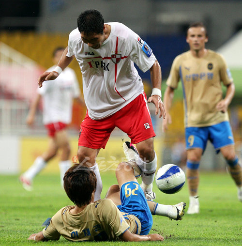 18일 오후 부산아시아드주경기장에서 열린 FA컵 8강전 부산 아이파크와 인천 유나이티드의 경기에서 부산 정성훈과 인천 이재권이 볼을 다투고 있다.