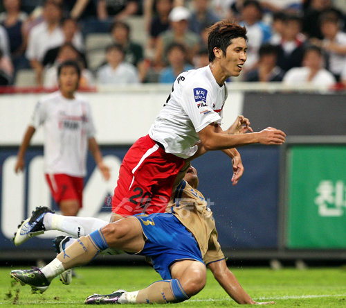18일 오후 부산아시아드주경기장에서 열린 FA컵 8강전 부산 아이파크와 인천 유나이티드의 경기. 부산 한상운과 인천 이세주가 볼을 다투다 넘어지고 있다.