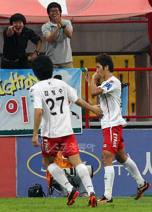 18일 오후 부산아시아드주경기장에서 열린 FA컵 8강전 부산 아이파크와 인천 유나이티드의 경기. 후반 1대 0 상황에 동점골을 터트린 부산 한상운(오른쪽)이 세리머니하고 있다.