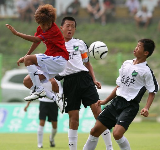 19일 경북 경주시 구황동 알천2구장에서 열린 ‘2010 경주 국제 유소년(U-12) 축구 페스티벌’ 한국 화랑팀과 중국 절강 록성팀의 경기에서 공중볼을 차지하기 위해 날아든 한국 장결희에 놀라 중국 선수들의 표정이 재미있다.