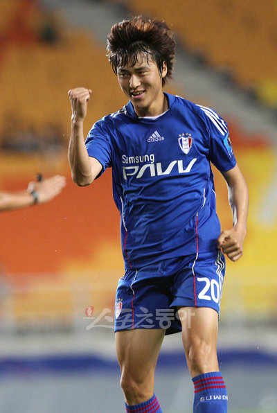 파랑새 부활 날갯짓 수원 백지훈이 7월 21일 열린 FA컵 16강전 수원시청과의 경기에서 골을 넣은 뒤 기뻐하고 있다. 윤성효 감독 취임 이후 수원은 백지훈 등 핵심 멤버들의 부활과 함께 상승세를 타고 있다.