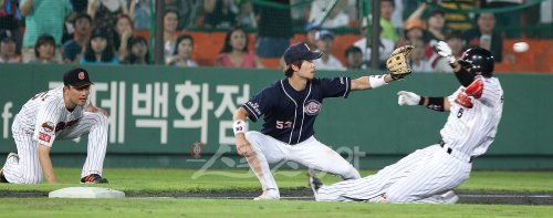20일 부산 사직야구장에서 열린 2010 프로야구 롯데와 두산의 경기에서 5회말 선두타자 황재균이 중간 패스를 맞히는 타구에 3루 까지 진루해 세이프되고 있다.