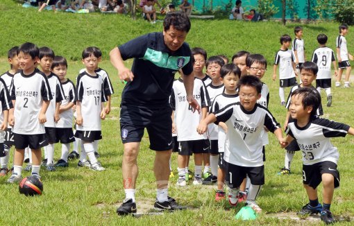 22일 오전 서울 광진구 능동 어린이회관 과학관에서 육영재단 정해성축구아카데미 창단식이 열렸다. 정해성 전 국가대표팀 수석코치가 유소년들과 미니 게임 전에 간단한 훈련을 하며 몸을 풀고 있다.