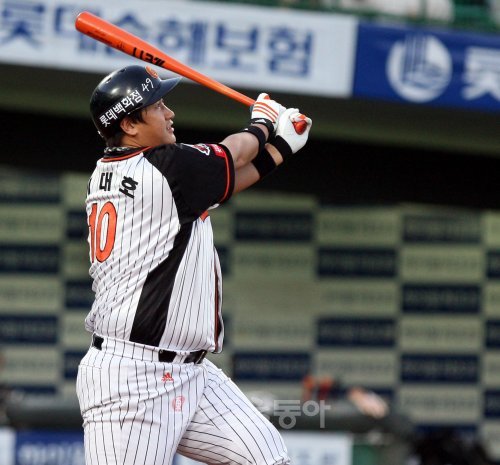 22일 저녁 부산 사직야구장에서 열린 2010프로야구 롯데와 두산의 경기에서 6회말 1사 2루 롯데 타자 이대호가 시즌 41호 홈런을 치고 있다.