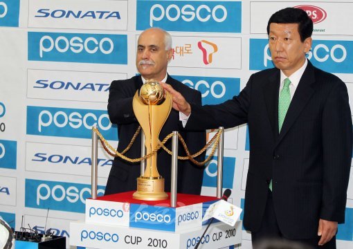 23일 오전 서울 종로구 신문로 축구회관 대회의실에서 포스코컵 2010 결승 기자회견이 열렸다. 전북현대 감독 최강희(오른쪽)와 FC서울 감독 넬로 빙가다가 챔피언 트로피 앞에서 포토타임을 갖고 있다.