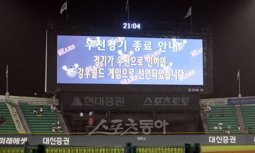 24일 저녁 서울 잠실야구장에서 2010 프로야구 두산 베어스와 LG 트윈스의 경기가 열렸다. LG와 두산이 2-2 동점인 6회초 강우콜드로 경기 종료를 알리는내용이 전광판이 표시되고 있다.