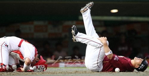 25일 인천 문학야구장에서 열린 2010 프로야구 SK와 넥센의 경기에서 2회초 2사 1, 2루 상황. 강귀태의 적시타에 3루주자 이숭용이 홈으로 쇄도하다 포수 정상호와 부딪쳐 왼쪽다리에 고통을 호소하고 있다.