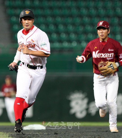 25일 인천 문학야구장에서 열린 2010 프로야구 SK와 넥센의 경기에서 5회말 1사 1, 3루 상황. 박정권의 희생플라이에 2루 진루하던 1루 주자 김재현이 귀루하고 있다.