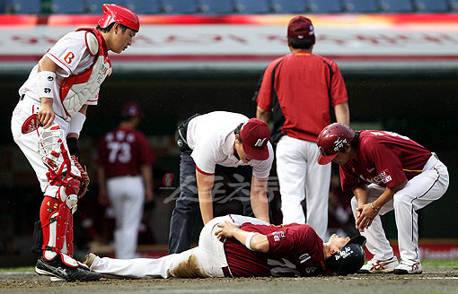 프로야구 수난시대 넥센 이숭용이 25일 문학 SK전 2회초 2사 1·2루서 강귀태의 안타 때 홈으로 뛰어들다 포수 정상호와 충돌한 뒤 쓰러져 고통스러워하고 있다. 문학 | 임진환 기자 photolim@donga.com