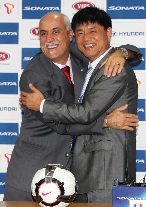 FC서울 넬로 빙가다 감독(왼쪽)과 수원 삼성 윤성효 감독이 26일 오후 서울 종로구 신문로 축구회관에서 28일 수원 월드컵 경기장에서 열리는 라이벌 전을 앞두고 기자회견을 가진 뒤 서로 포옹하며 포즈를 취하고 있다.