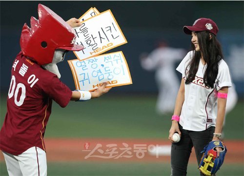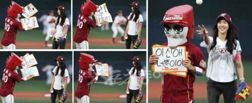2010 프로야구 넥센히어로즈 대 한화이글스 경기가 26일 목동야구장에서 열렸다. 경기 전 넥센 마스코트 턱돌이가 시구를 한 탤런트 장미인애에게 사랑고백(?)을 하는 듯 하다 다른 여자의 이름을 보이고 도망가자 장미인애가 쫓아가며 볼을 던지고 있다 .