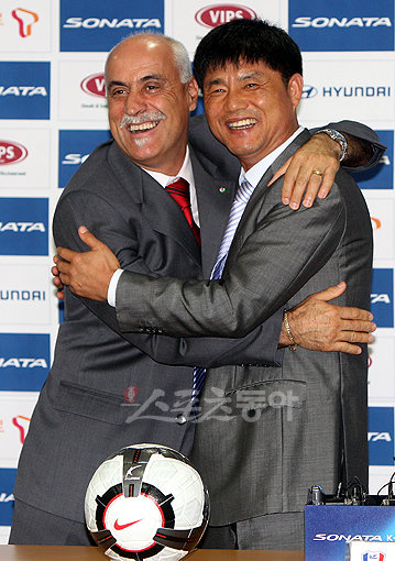 적과의 포옹 주말 슈퍼매치를 앞두고 26일 축구회관에서 열린 미디어데이에 참석한 FC서울 넬로 빙가다 감독(왼쪽)과 수원 삼성 윤성효 감독이 서로 끌어안으며 선전을 다짐하고 있다. 임진환 기자 photolim@donga.com