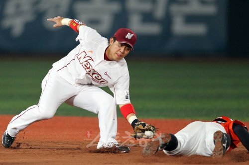 27일 저녁 서울 목동야구장에서 열린 2010 프로야구 넥센 히어로즈와 한화 이글스의 경기에서 4회초 환화 공격 1사 1루 주자 이상훈이 이대수 타석 때 도루에 성공하고 있다.