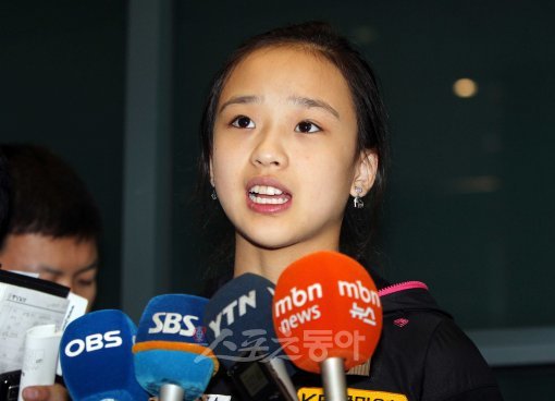한국 리듬체조의 간판 손연재(세종고)가 2010 리듬체조 월드컵 대회에서 톱10 진입에 실패한 후 31일 오후 인천국제공항을 통해 입국해 취재진과의 인터뷰를 갖고 있다.