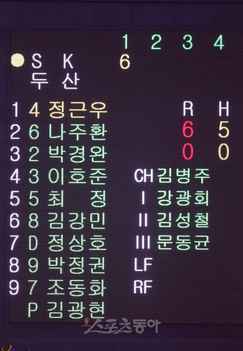 3일 저녁 서울 잠실야구장에서 열린 2010 프로야구 두산 베어스와 SK 와이번스의 경기에서 1회초 SK가 두산을 6대 1로 앞서고 있는 내용을 전광판이 알리고 있다.