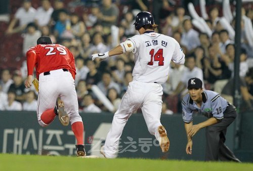 3일 저녁 서울 잠실야구장에서 열린 2010 프로야구 두산 베어스와 SK 와이번스의 경기에서 두산 공격 3회말 2 상황에서 SK 선발투수 김광현이 1루에서 타자주자인 고영민을 아웃 시키고 있다.