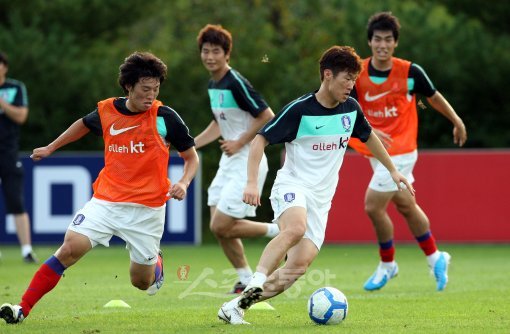 캡틴의 질주 7일 서울 월드컵경기장에서 열리는 이란과의 평가전을 앞두고 3일 파주 NFC에서 열린 국가대표팀 훈련에서 박지성이 드리블을 하고 있다. 조광래 감독은 이란전에서 박지성을 키플레이어로 새로운 전술을 실험한다. 파주 | 박화용 기자 inphoto@donga.com