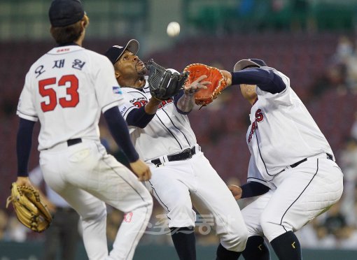 3일 저녁 서울 잠실야구장에서 열린 2010 프로야구 두산 베어스와 SK 와이번스의 경기에서 2회초 SK공격 1사 SK의 박경완의 플라이를 두산의 왈론드와 최준석이 처리하지 못하고 있다. 잠실 | 국경원 기자 onecut@donga.com