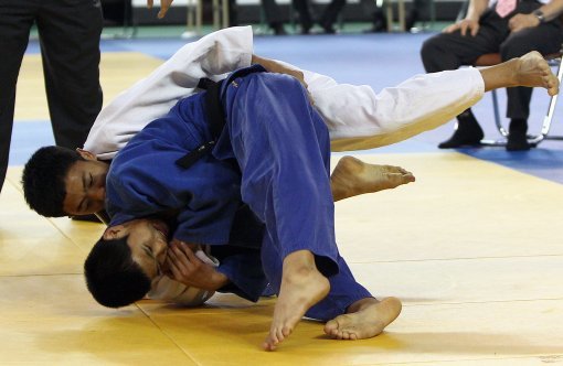 김성민(청색·계성중)이 3일 경북 김천실내체육관에서 열린 ‘최민호 올림픽제패기념 2010추계전국중·고등학교 유도연맹전’ 남중부 -51kg급 결승전에서 정용욱(백색·덕원중)이 건 기술에 넘어가지 않기 위해 안간힘을 쓰고 있다.