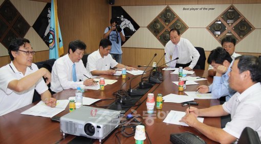 김용희, 서정환, 조범현 대표팀 감독, 김인식 기술위원장, 김성한, 이순철, 강문길 기술위원(왼쪽부터)전원이 6일 오전 서울 강남구 도곡동 야구회관에서 열린 한국야구위원회 기술위원회에서 오는 11월 중국 광저우 아시안게임에 출전할 대표팀 최종 엔트리 선발을 위한 회의를 시작하고 있다.