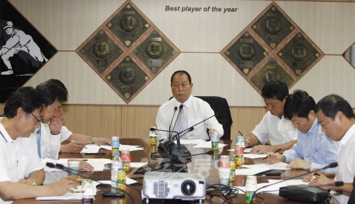김용희, 서정환, 조범현 대표팀 감독, 김인식 기술위원장, 김성한, 이순철, 강문길 기술위원(왼쪽부터)전원이 6일 오전 서울 강남구 도곡동 야구회관에서 열린 한국야구위원회 기술위원회에서 오는 11월 중국 광저우 아시안게임에 출전할 대표팀 최종 엔트리 선발을 위한 회의를 하고 있다.