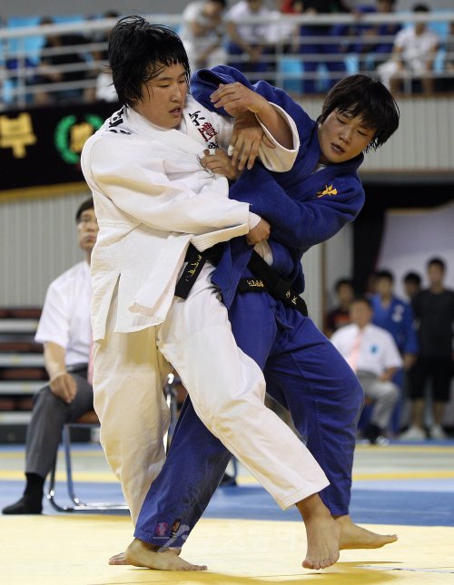 6일 경북 김천 실내체육관에서 열린 스포츠동아가 주최하는 최민호 올림픽제패기념 2010 추계전국 중·고등학교 유도연맹전 여자고등부 -63Kg 결승전에서 청 김은지(광영여고)와 백 황희정(경기체고)이 열띤 경합을 펼치고 있다.