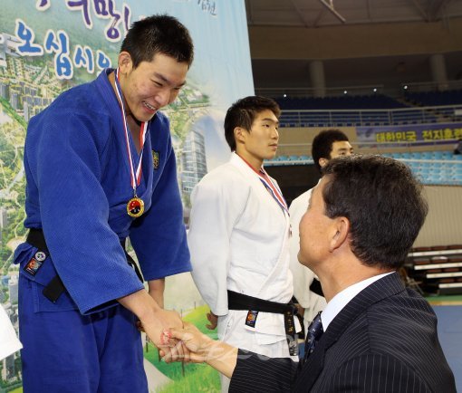 7일 경북 김천 실내체육관에서 열린 스포츠동아가 주최하는 최민호 올림픽제패기념 2010 추계전국 중·고등학교 유도연맹전 남자고등부 -81kg에서 우승한 이재형(보성고)이 한국 중고 유도연맹 최성배 회장으로 부터 메달을 수여받고 악수하고 있다.