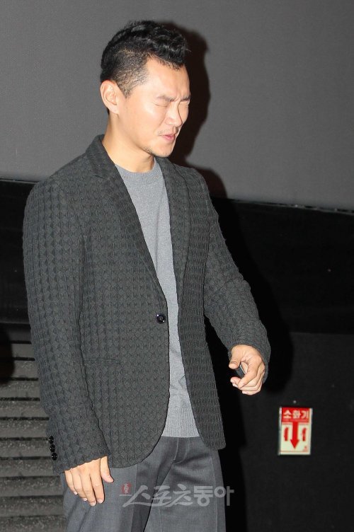 7일 오후 서울 용산구 용산역CGV에서 열린 영화 '그랑프리'시사회에서 배우 양동근이 무대인사를 하던 중 취재진의 카메라 플래쉬에 눈이 부신 듯 눈을 감고 있다.