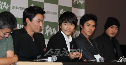 배우 주진모, 송승헌, 김강우, 조한선(왼쪽부터)이 8일 오후 서울 성동구 행당동 왕십리CGV에서 열린 영화 '무적자'(송해성 감독, 핑거프린트 제작)의 언론 시사회에서 기자간담회를 갖고 있다.
