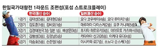 5경기 열도의 왕별 이시카와 샷대결현대캐피탈 인비테이셔널 한일프로골프 국가대항전 1라운드 포섬경기에서 김대현(22·하이트)과 김대섭(29·삼화저축은행)이 선봉에 나서 일본의 오다 코우메이(32), 오다 류이치(34)와 대결을 펼친다.