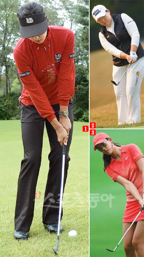 또 한 가지. 그린 근처에서 칩샷이나 어프로치 샷을 할 때 아마추어들이 주의해야 할 것은 헤드업을 하지 않는 것이다. 신지애와 미셸 위는 어프로치 샷 때 시선은 볼을 향해 있지만 머리는 여전히 볼 뒤쪽에 있다. 아무리 짧은 거리의 샷이라 해도 볼이 그린에 안착할 때까지 이와 같은 자세를 유지하는 버릇을 들이면 어프로치 샷 성공률을 더욱 높일 수 있다.