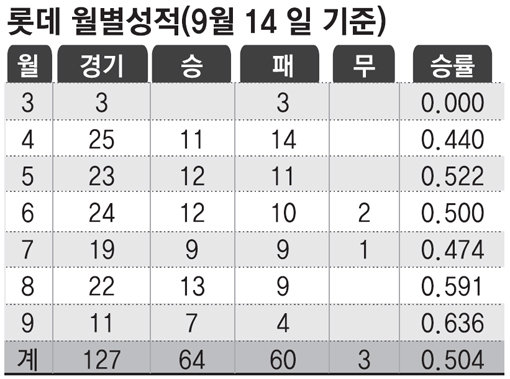 그리고 이달 2∼3일 호랑이 굴로 들어간 롯데는 배수진을 친 KIA에 각각 6-1, 10-6의 승리를 신고하며 사실상 4강행의 9부 능선을 넘었다. 롯데와 KIA의 간격은 다시 6.5게임차로 벌어졌다. 페넌트레이스 종료까지 롯데가 14게임, KIA가 13게임을 남겨둔 상황에서 4강 경쟁에 쐐기를 박은 것이다.