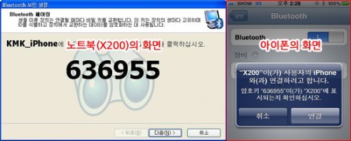 이 단계에서 아이폰의 블루투스 메뉴를 보면 장비 창에 검색 중이 아닌 X200이 표시될 것이다. 이는 아이폰과 X200 모두 블루투스가 켜져 있지만 서로 페어링(연결)되지 않은 상태라는 뜻이다. 이제 양쪽 기기 중 어느 쪽이든 연결을 요청하고 이를 수락하면 되며, 연결될 때 보안책인 ‘비밀 키’를 교환하게 되어 있으니 꼭 확인하도록 하자.
