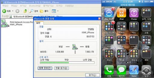 페어링까지 마쳤다면 이제 인터넷 테더링을 위한 모든 준비는 끝난 셈이다. X200과 아이폰에서 연결 상태를 모두 확인할 수 있는데, 아래 사진처럼 아이폰은 대기화면이나 배경화면에서 확인할 수 있고, 연결된 노트북은 블루투스 연결 상태를 보면 확인할 수 있다.