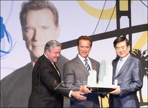 15일 서울 서초구 반포동 JW메리어트호텔에서 현대자동차와 캘리포니아 내 투자 증진 협력발표 행사가 로스엔젤레스 상공회의소와 캘리포니아 관광청의 주최로 열렸다. 대한한공 조양호 회장이 아놀드슈왈제네거에게 선물을 건넨 뒤 기념촬영을 하고 있다.