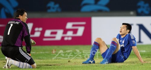 15일 오후 경기도 성남 탄천종합운동장에서 열린 아시아축구연맹(AFC) 챔피언스리그 8강 1차전 성남과 수원의 후반 경기에서 수원 양상민이 자책골을 넣을 뒤 허탈해 하고 있다.