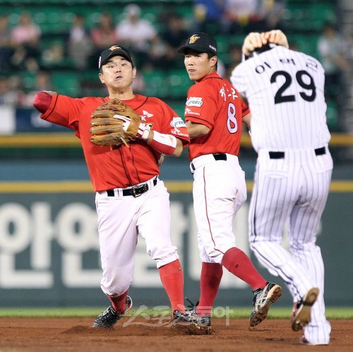 16일 서울 잠실야구장에서 열린 2010 프로야구 LG와 SK의 경기에서 4회말 무사 1루 상황에 조인성의 병살타에 이택근이 포스아웃되고 있다.