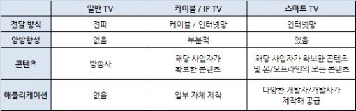 위 표는 각 TV가 발전해 온 단계라고 생각하면 이해하기 쉽다. 비가 오거나 천둥이 치면 TV가 잘 나오지 않아 안테나를 만져야 했던 예전 일반 TV를 생각해보자. ‘바보상자’라고 불리기도 한 이때의 TV는 방송사가 송출하는 전파를 받기만 하는 단방향 방식이었다.