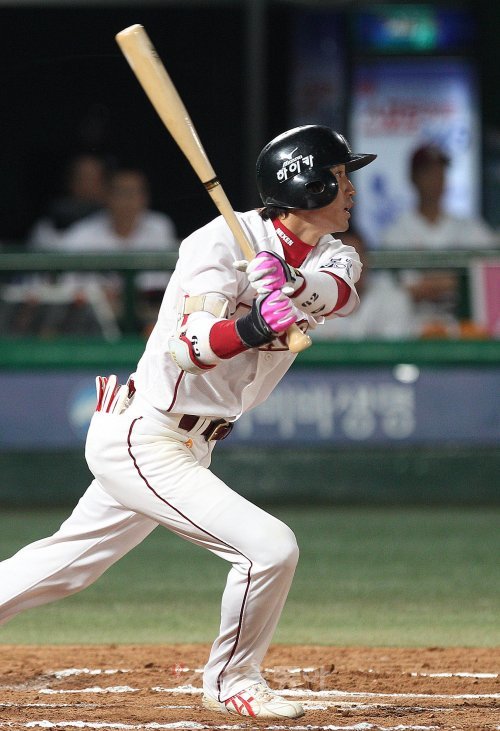 17일 서울 목동야구장에서 열린 2010 프로야구 넥센과 두산의 경기에서 5회말 2사 2루 상황에 장기영이 1타점 적시타를 때려내고 있다.