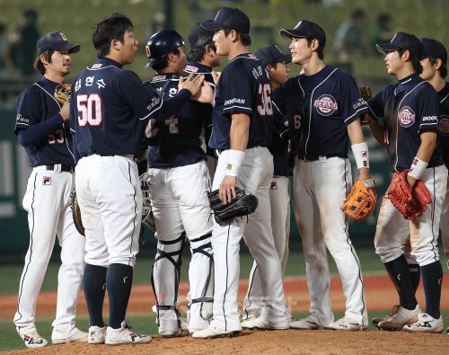 17일 서울 목동야구장에서 열린 2010 프로야구 넥센과 두산의 경기에서 연장 10회경기 끝에 6대 1로 승리한 두산 선수들이 경기가 끝나자 마운드에 올라 기쁨을 나누고 있다.