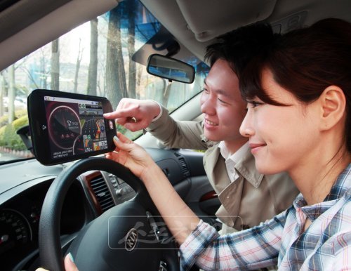 SK텔레콤이 추석을 맞아 내놓은 ‘T-맵 네비게이션’을 모델들이 시연해보고 있다.