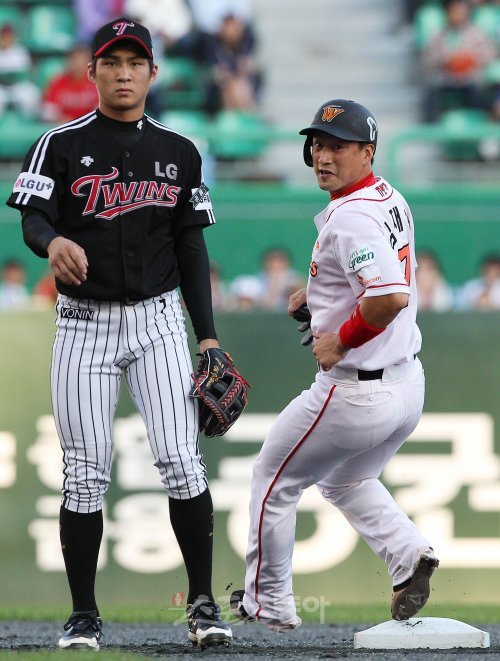 23일 인천 문학야구장에서 열린 2010 프로야구 SK와 LG의 경기에서 4회말 무사 1루 상황에 안치용의 희생타에 김재현이 2루에 안착하고 있다.