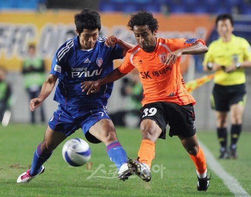 29일 저녁 수원 팔달구 우만동 수원월드컵경기장에서 열린 '2010 하나은행 FA CUP' 수원삼성과 제주유나이티드의 경기에서 수원의 이상호와 제주의 산토스가 볼을 다투고 있다.
