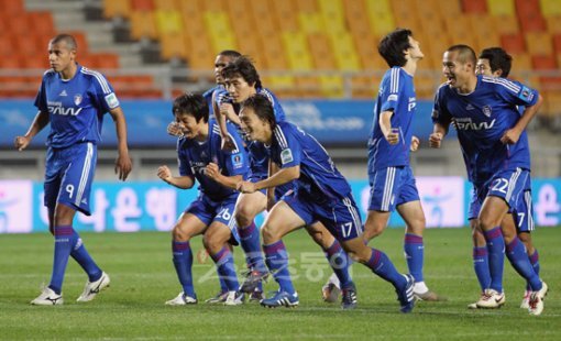 “이젠 우승이다” 수원삼성 선수들이 29일 수원월드컵경기장에서 열린 2010 하나은행 FA컵 4강전에서 승부차기 끝에 결승 진출을 확정짓자 환호하며 골문을 향해 달려가고 있다.수원 | 국경원 기자 onecut@donga.com