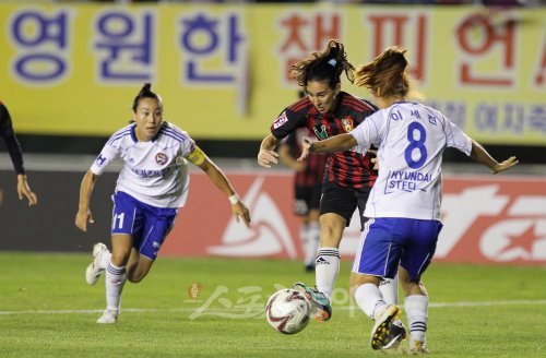 30일 저녁 울산시 중구 남외동 종합운동장에서 '대교 눈높이 2010 WK리그 챔피언 결정전 2차전' 수원FMC과 현대제철의 경기가 열렸다. 전반전 수원의 까리나가 상대편을 뚫고 공격을 시도하고 있다.