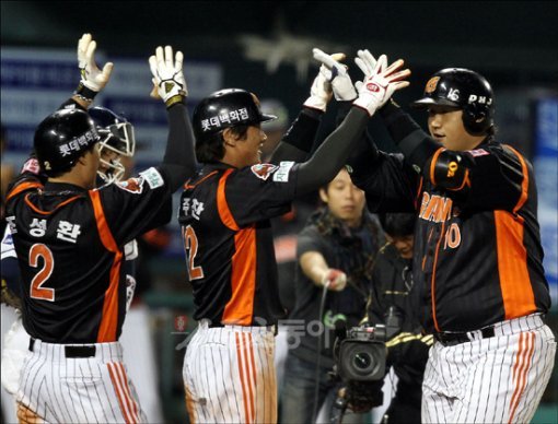 이대호의 영웅본색 먼저 홈플레이트에 도달한 조성환(왼쪽)과 김주찬(가운데)은 이대호를 영접했다. 연장 10회초 결승 3점홈런. 그가 왜 ‘부산의 영웅’인지에 대한 설명은 이 한방으로 충분했다. 롯데는 이 하이파이브와 함께 부산으로 가벼운 발걸음을 옮겼다.