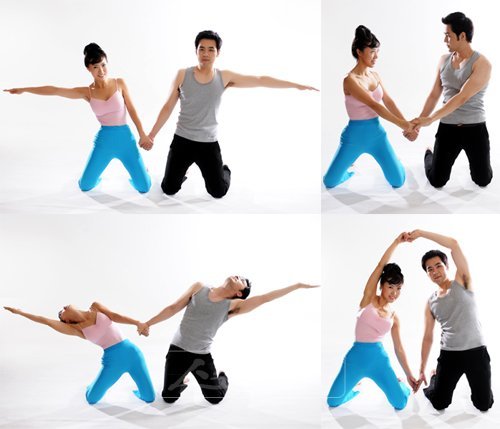 1. 커플이 무릎으로 서서 어깨넓이로 벌리고 서서 손을 맞잡는다. 바깥쪽 손을 수평으로 들어준다. 10초 정지.