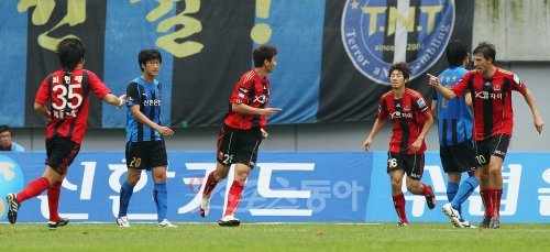 3일 오후 서울 마포구 성산동 월드컵경기장에서 열린 쏘나타 K-리그 FC서울과 인천유나이티드의 경기가 열렸다. 전반전 서울의 이승렬이 선제골을 터뜨린 후 동료들과 기쁨을 나누고 있다.
