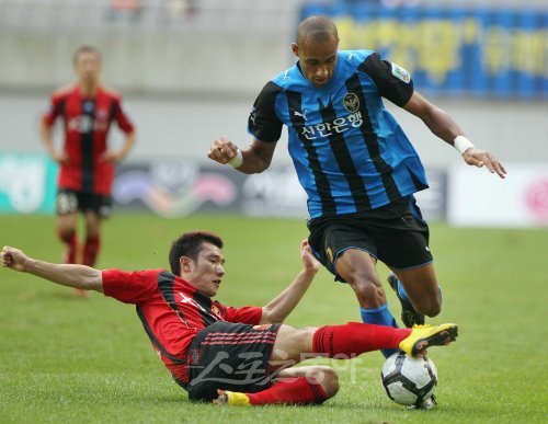 3일 오후 서울 마포구 성산동 월드컵경기장에서 열린 쏘나타 K-리그 FC서울과 인천유나이티드의 경기가 열렸다. 전반전 서울의 최효진이 인천의 브루노의 볼을 뺏기 위해 태클을 하고 있다.